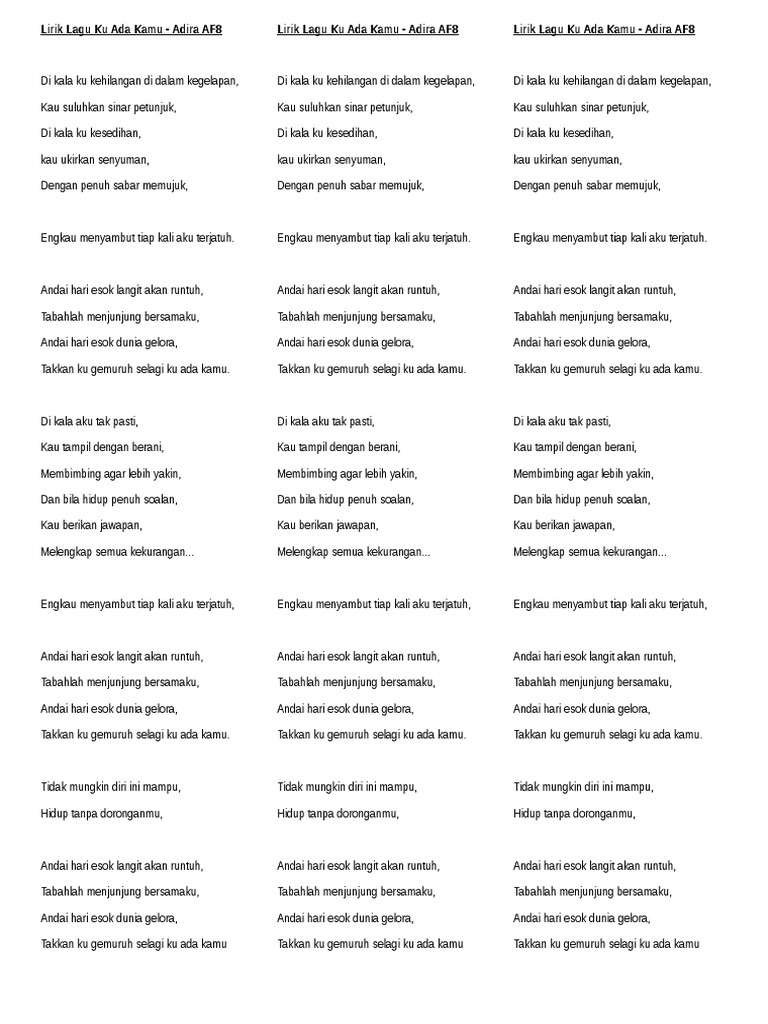 Takkan ku gemuruh selagi ku ada kamu. Andai hari esok langit akan runtuh Tabahlah menjunjung bersamaku Andai hari esok dunia gelora Takkan ku gemuruh selagi ku ada kamu. Lirik Lagu Ku Ada Kamu - Adira AF8 Di kala ku kehilangan di dalam kegelapan Kau suluhkan sinar petunjuk Di kala ku kesedihan kau ukirkan senyuman Dengan penuh sabar memujuk Engkau menyambut tiap kali aku terjatuh.